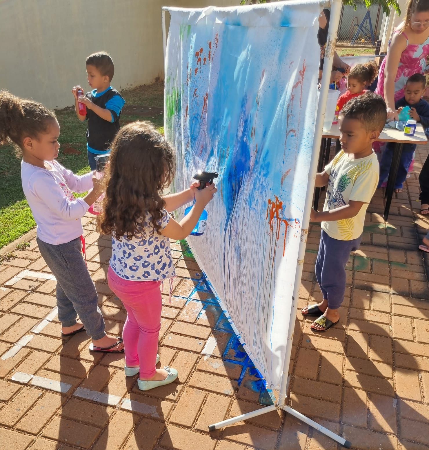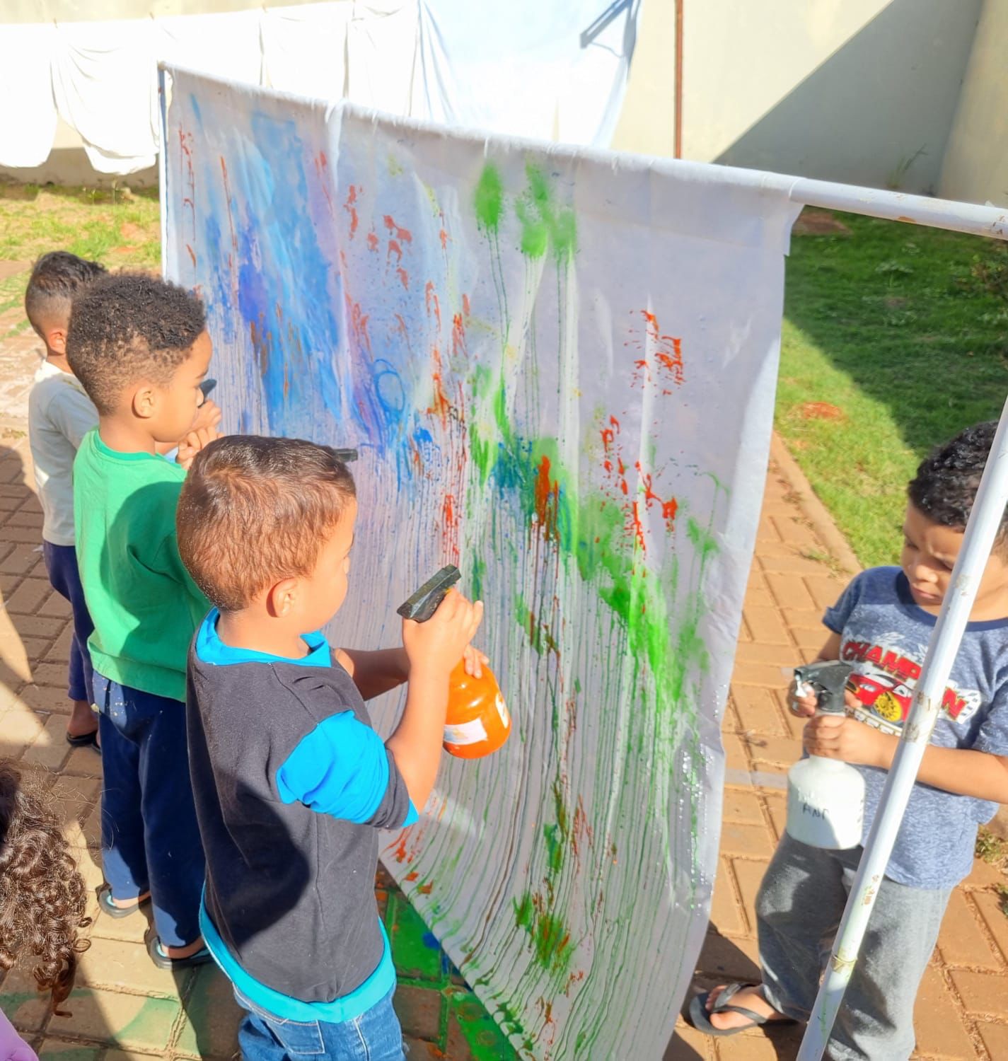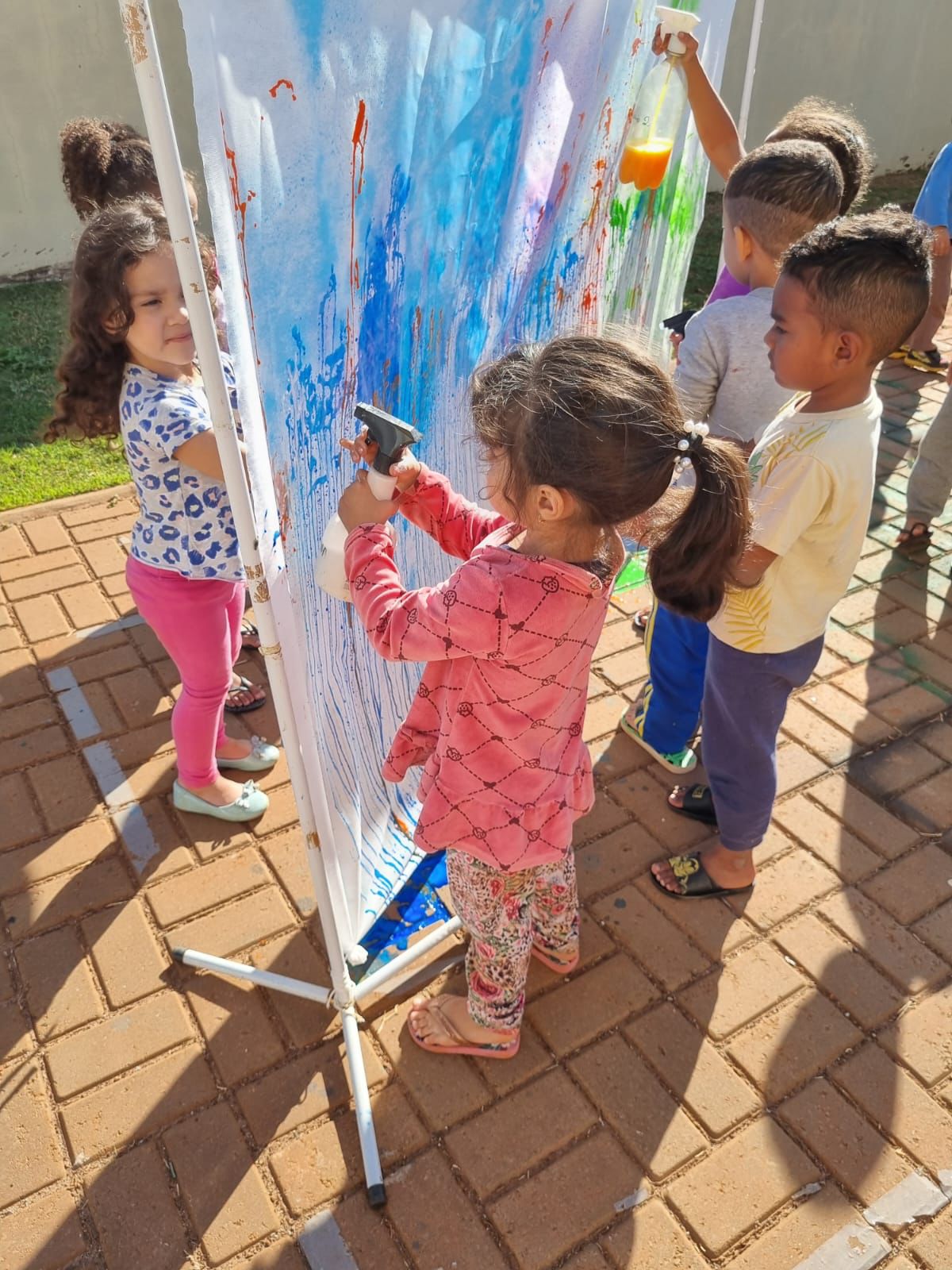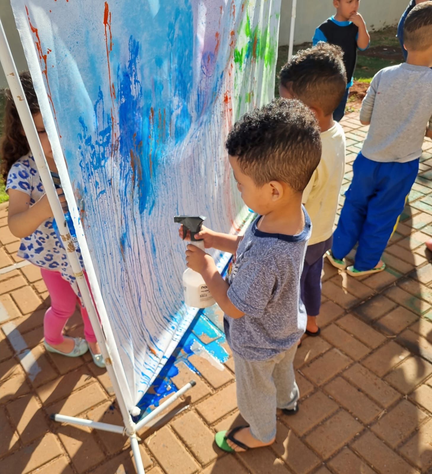 As crianças da comunidade Quinta dos Castanheiras, matriculadas no CEI "Irene Sueko Miyashiro", tiveram uma semana produtiva e de muita arte por meio de pinturas. A realização das atividades vem ao encontro da proposta do SSE (Sistema Sesi de Ensino) introduzido este ano na Educação Infantil de 0 a 3 anos. Essas experiências estão em consonância com o arranjo, Ateliê de Mistura que consiste na utilização de uma diversidade de técnicas a partir de materiais não estruturados, inspirado na abordagem de Réggio Emilia que é referência em ateliês para educação infantil.