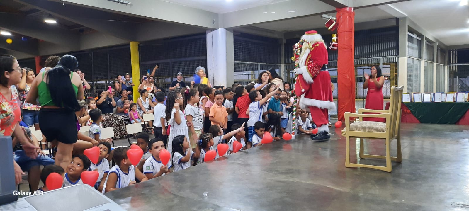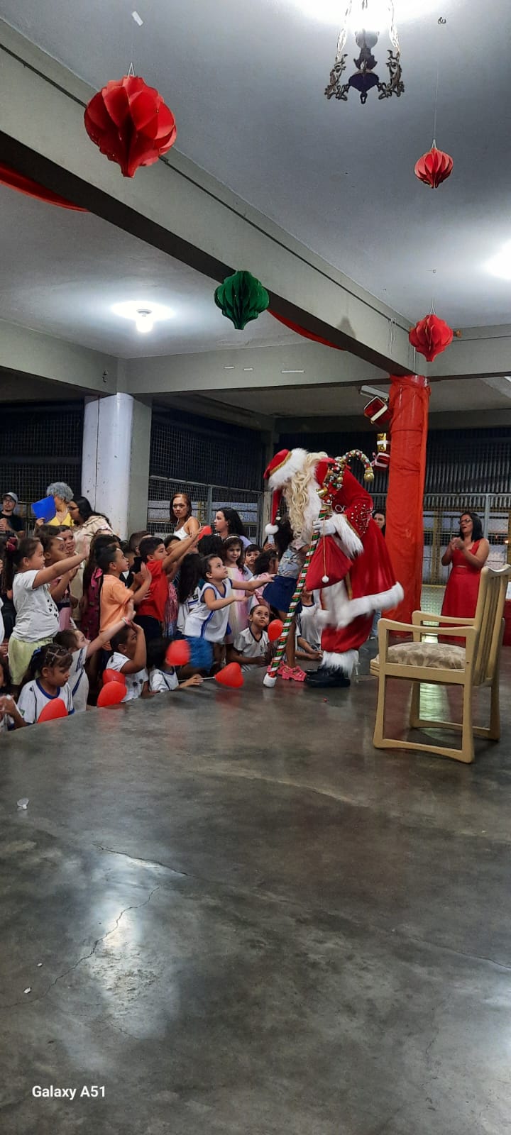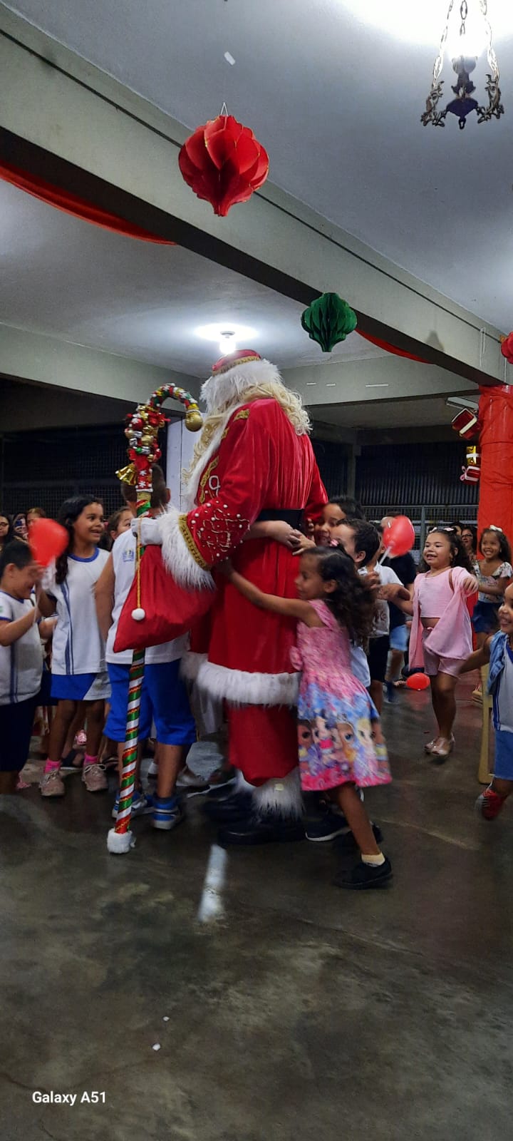 A noite culminou com todos os presentes, incluindo os alunos dos 1ºs anos, entoando a música "Vem que está chegando o Natal" e a chegada triunfante do Papai Noel, encerrando o evento com gratidão e alegria.