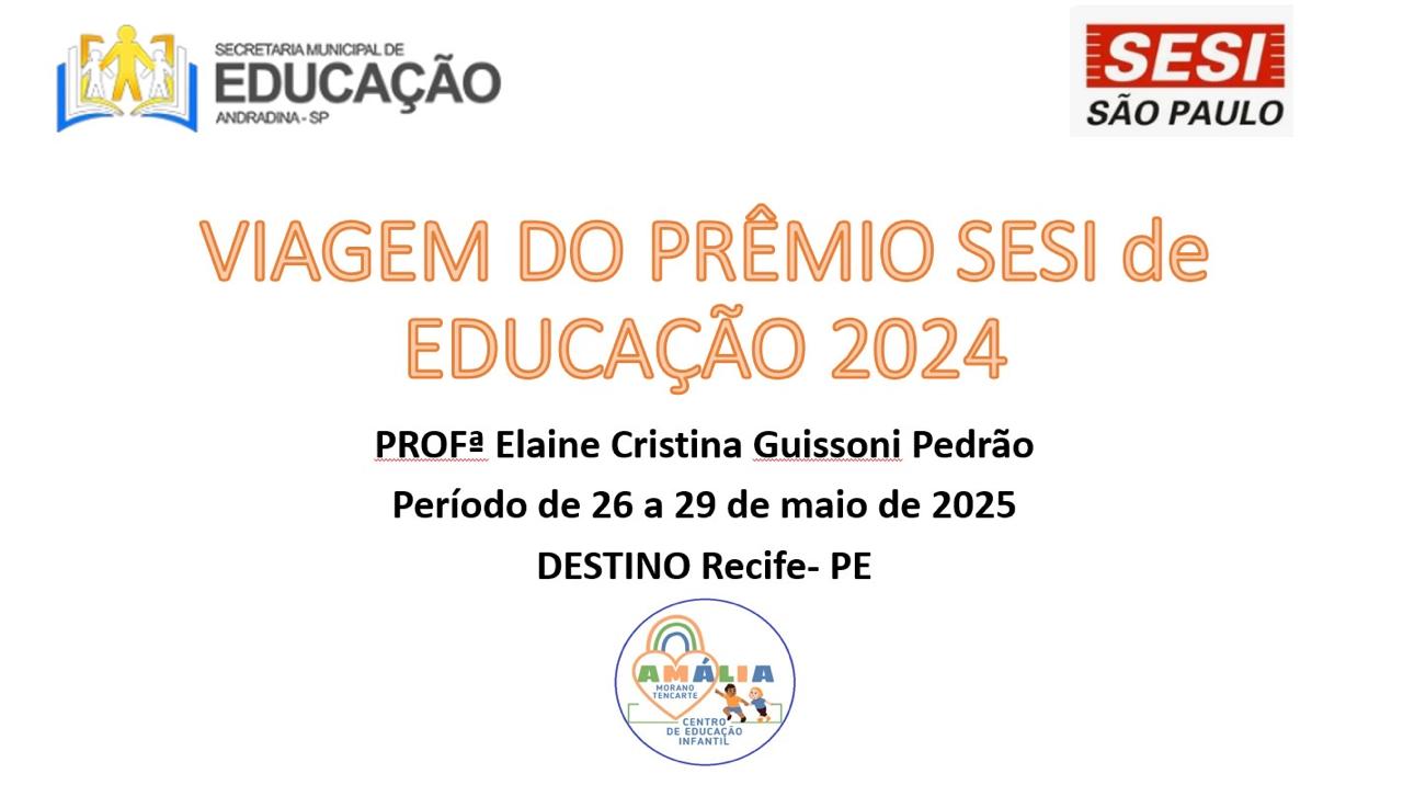 A professora Elaine Cristina Guissoni Pedrão, do CEI Amália Morano Tencarte, representou com orgulho a rede municipal de ensino ao ser premiada pelo Sistema SESI por sua prática pedagógica na Educação Infantil. Como reconhecimento, participou de uma viagem pedagógica e cultural a Recife – PE, entre os dias 26 e 29 de maio de 2025, ao lado de outros educadores de destaque de todo o país.