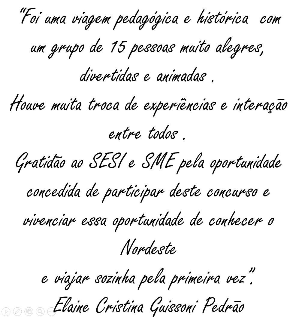 “Foi uma viagem pedagógica e histórica com um grupo de 15 pessoas muito alegres, divertidas e animadas. Houve muita troca de experiências e interação com todos. Gratidão ao SESI e à Secretaria Municipal de Educação pela oportunidade concedida de participar deste concurso e vivenciar essa oportunidade de conhecer o Nordeste e viajar sozinha pela primeira vez”, declarou emocionada a professora Elaine.