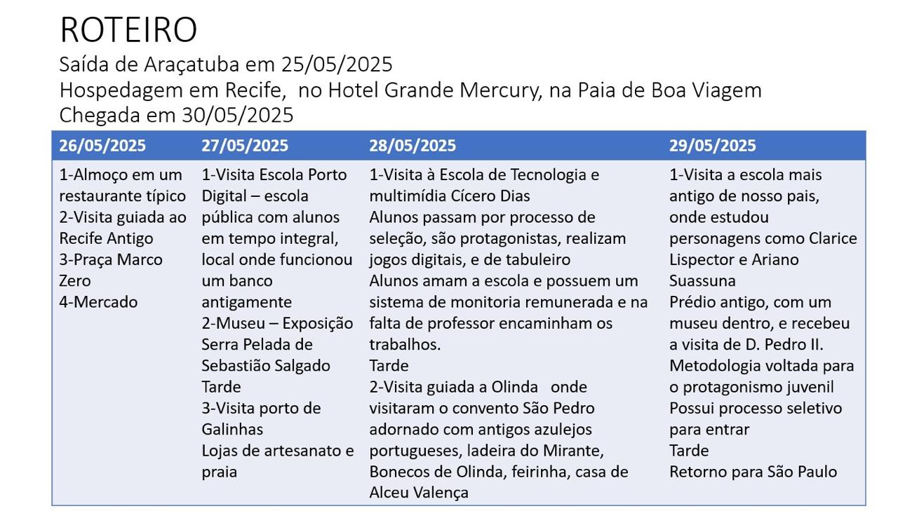 Durante a programação, Elaine teve a oportunidade de vivenciar experiências enriquecedoras com visitas guiadas a importantes instituições educacionais, culturais e tecnológicas da capital pernambucana e região. Entre os locais visitados estavam a Escola Porto Digital, a Escola de Tempo Integral Cicero Dias, o Museu Serra Pelada, além de um tour histórico por Olinda e a visita à escola mais antiga do Brasil, que já teve como alunos nomes como Clarice Lispector e Ariano Suassuna.