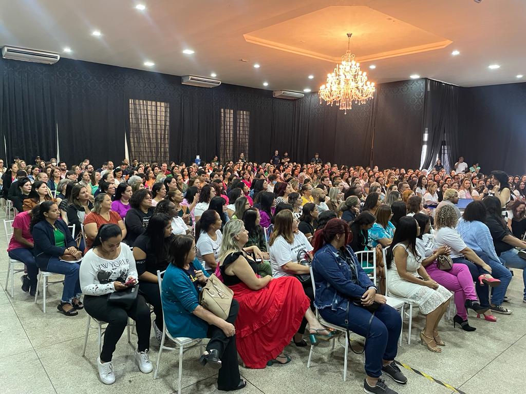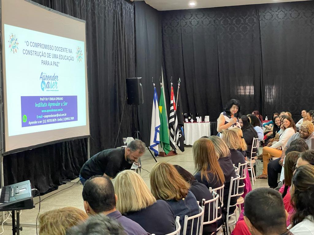 Em torno de 500 profissionais do magistério do Sistema de Ensino Municipal estiveram presentes no Clube Sírius Eventos durante a manhã do dia 26 de julho para um colóquio mais que especial com a Prof.ª Drª Emília Cipriano. O tema foi: “O compromisso docente na construção de uma Educação para Paz”. A professora Emília conduziu o colóquio de forma brilhante, partindo da premissa de que para se construir uma educação de qualidade é preciso dialogar com as ações (saberes, práticas e fundamentos), à luz dos estudos sobre a infância. Buscando articular os direitos da criança, ressignificando a ação docente dentro do contexto da prática pedagógica de cada um.