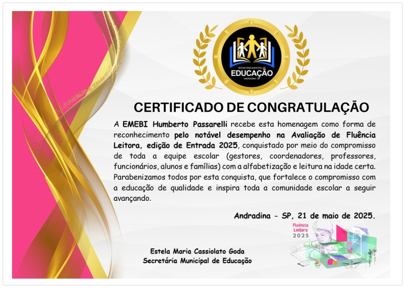 A Secretaria Municipal de Educação de Andradina prestou reconhecimento às escolas da rede municipal que se destacaram pela participação e desempenho na Avaliação de Fluência Leitora – Edição de Entrada 2025. A iniciativa reforça o compromisso da rede com a alfabetização e o desenvolvimento da leitura na idade certa, conforme os princípios do Compromisso Nacional Criança Alfabetizada.